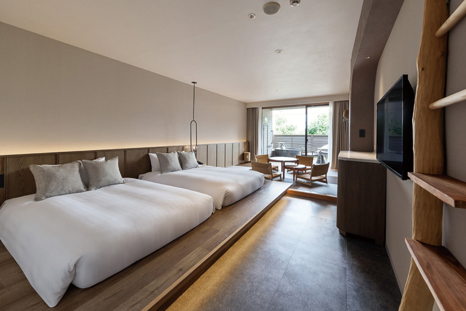 別荘地ならではの豊かな自然に囲まれた環境に位置しているこのホテルは、ゆったりとした部屋のつくりも特徴的です。6タイプある客室は露天風呂付きだったり、ペットと一緒に泊まれたりと目的に合わせて選ぶことができます。木の温もりを感じられるナチュラルテイストのインテリアが、居心地の良さを引き立てるでしょう。