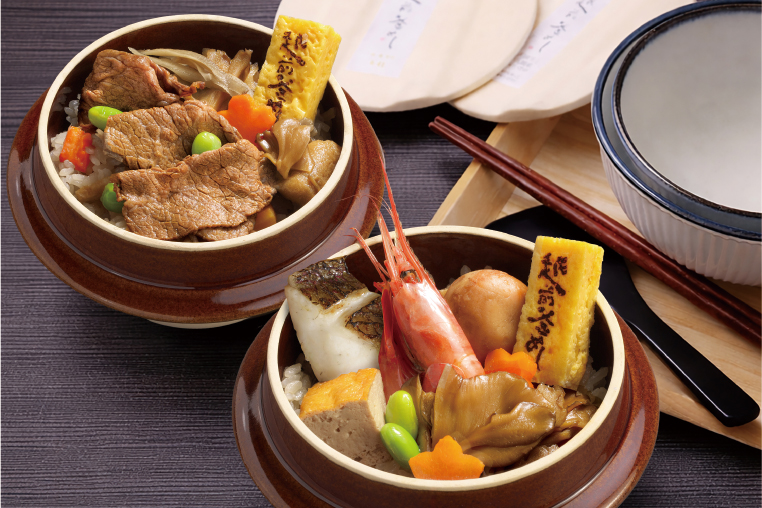 日本海の新鮮な海の幸と郷土料理の厚揚げ煮、湧き水で育つ里芋と幻のきのこ「九頭竜まいたけ」を詰め込んだ「ふくい五目」。希少な高級ブランド牛「若狭牛」と「九頭竜まいたけ」を100年続く老舗の特製出汁で炊き上げた、「若狭牛と九頭竜舞茸」。北陸・福井の本格釜めし2種セットです。