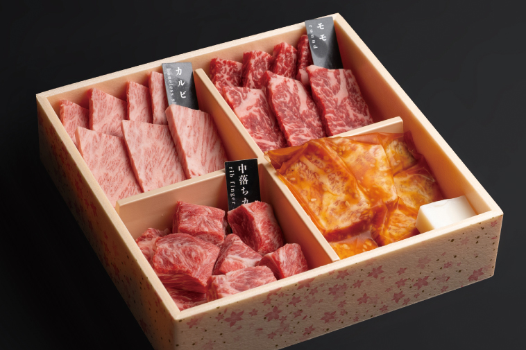 焼き肉の定番部位を詰め合わせ、異なる肉の特徴を一度に楽しめる「肉箱」です。脂身が少なく食べやすい和牛もも70g、肉汁と適度な食感が人気の和牛カルビ70g、脂がのって濃厚な旨味を楽しめる和牛中落カルビ70g、ご飯が進む和牛タレ漬けカルビ70gをお届けします。